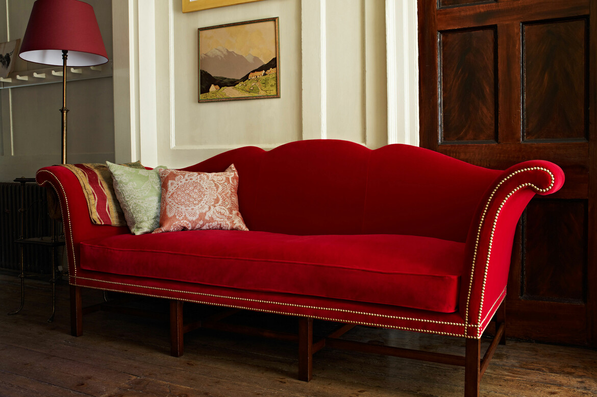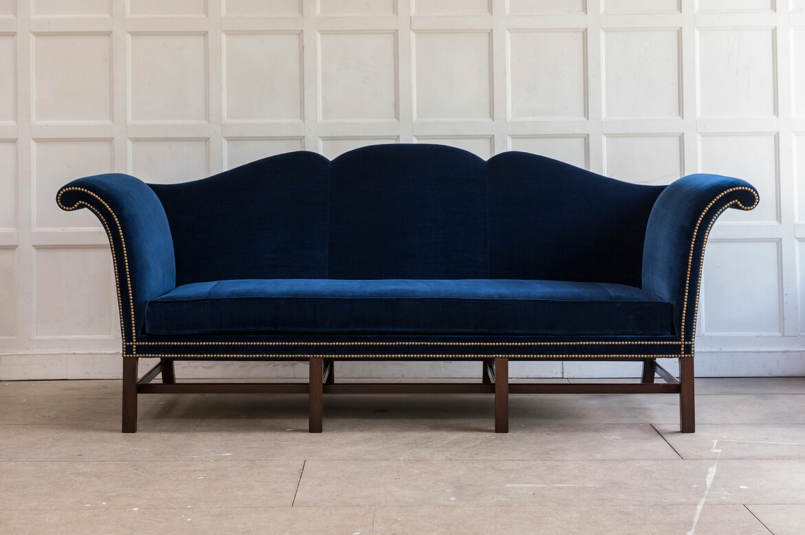 The Camelback Sofa is based a Georgian sofa circa 1760, made with mortice and tenoned solid beech frame and with polished walnut legs distressed to match the antique. The antiqued brass studs are individually applied by hand to create a high quality detailing. A deep feather wrapped seat cushion sits on a webbed base.