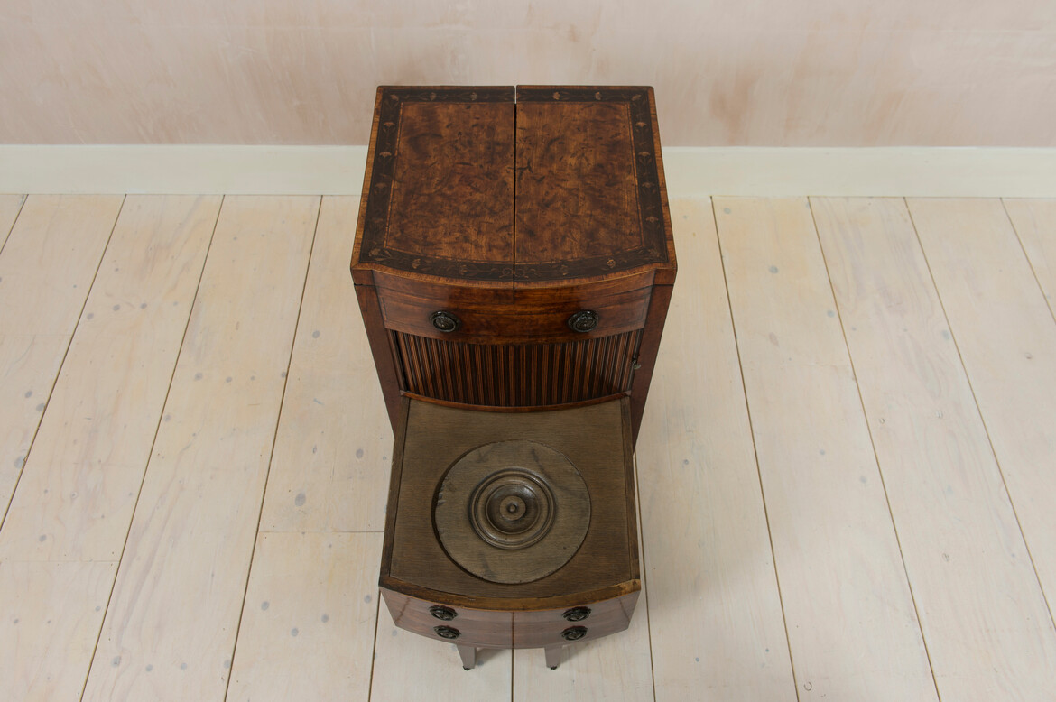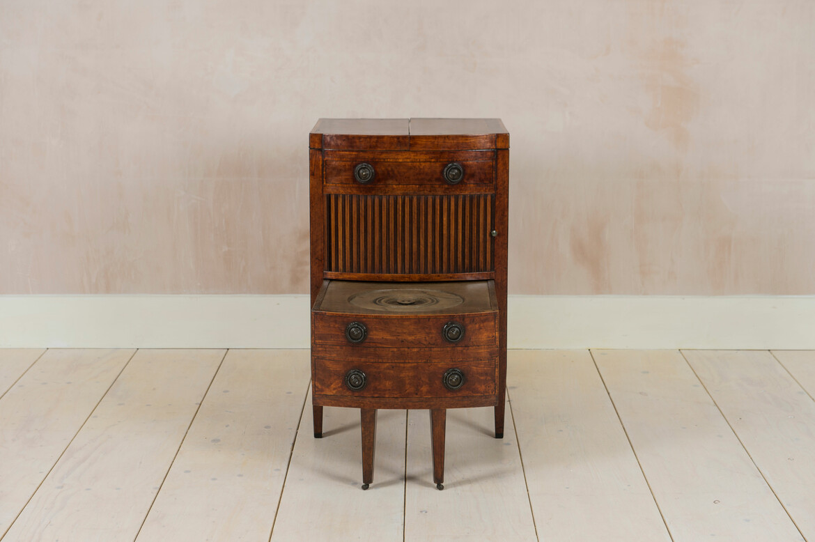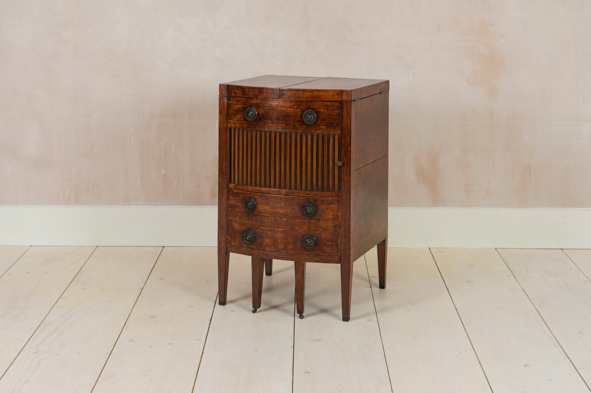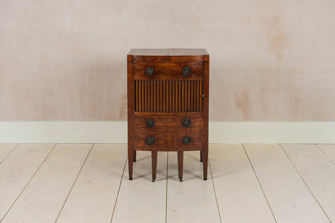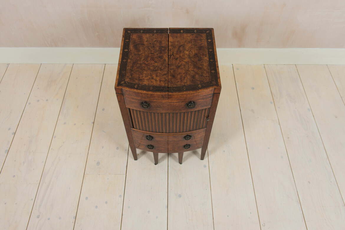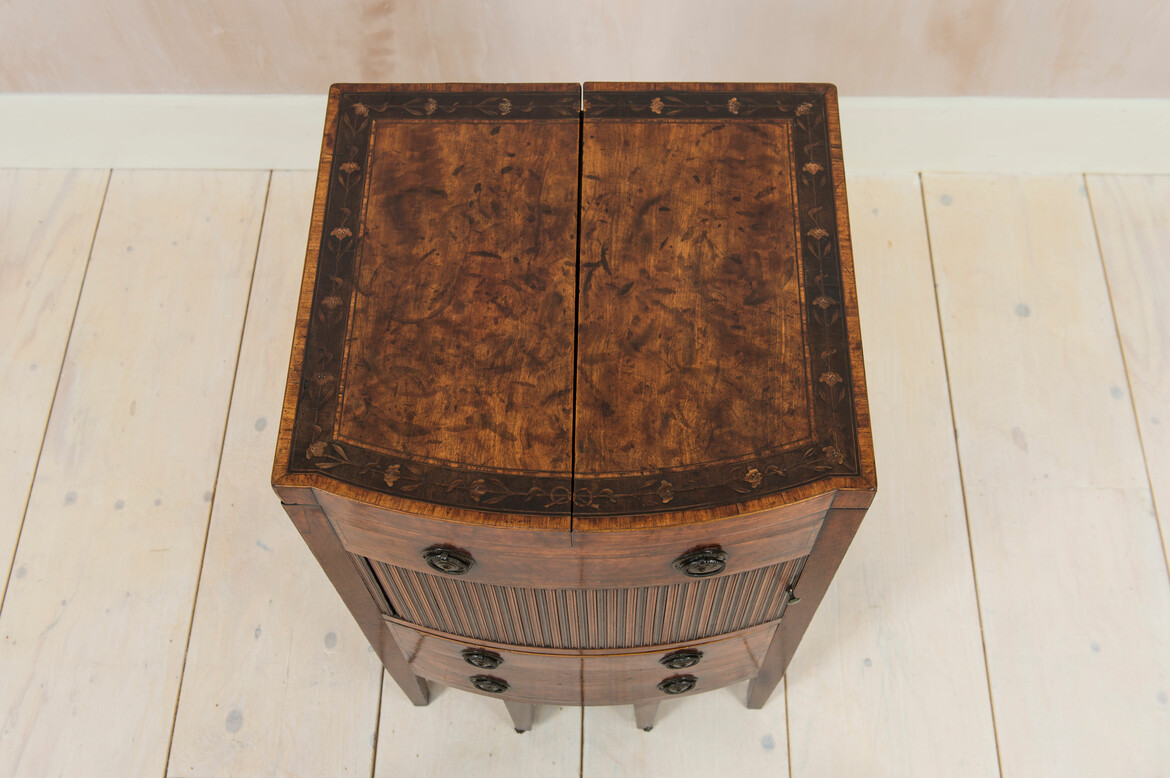 A fine George III satinwood bow-fronted bedside commode. The top ornamented with a floral decorated border. The front having a tambour door and all of its original handles. Wonderful patination. Circa 1790.