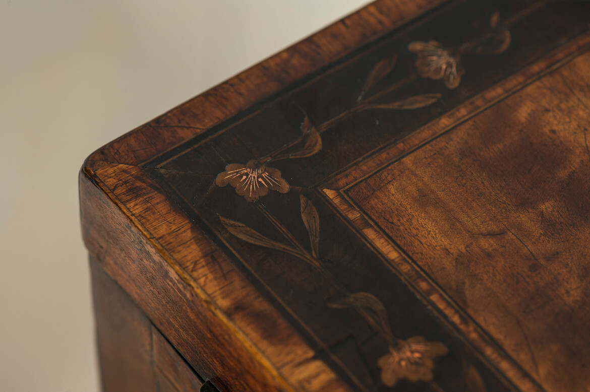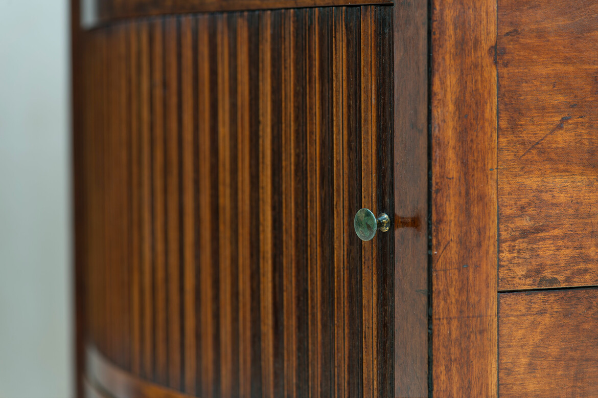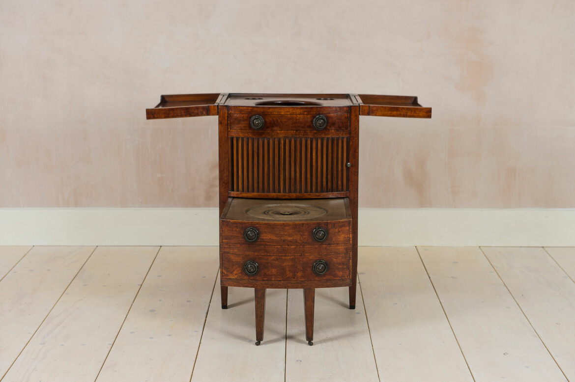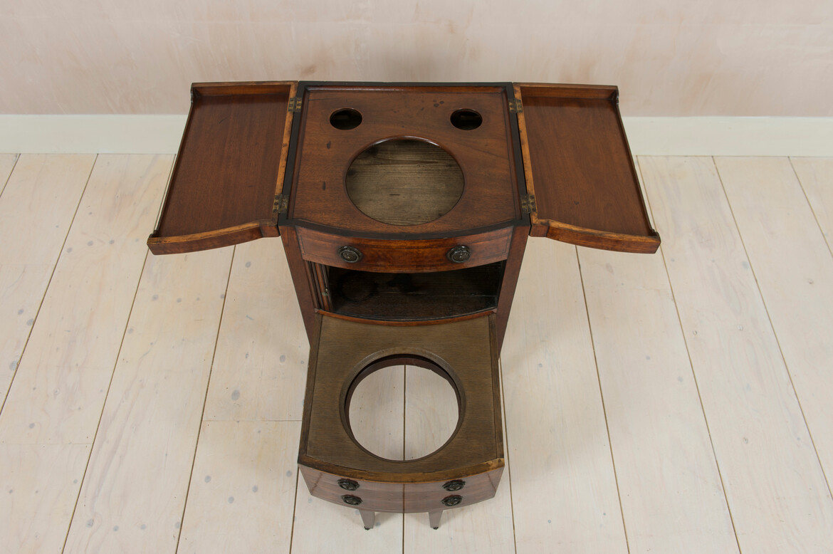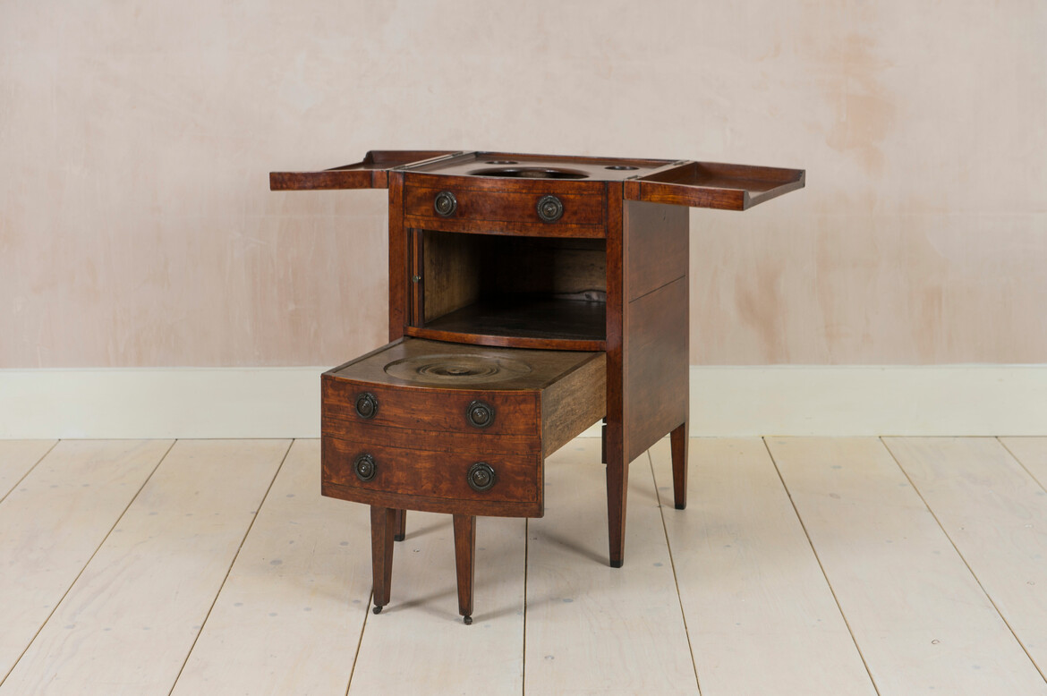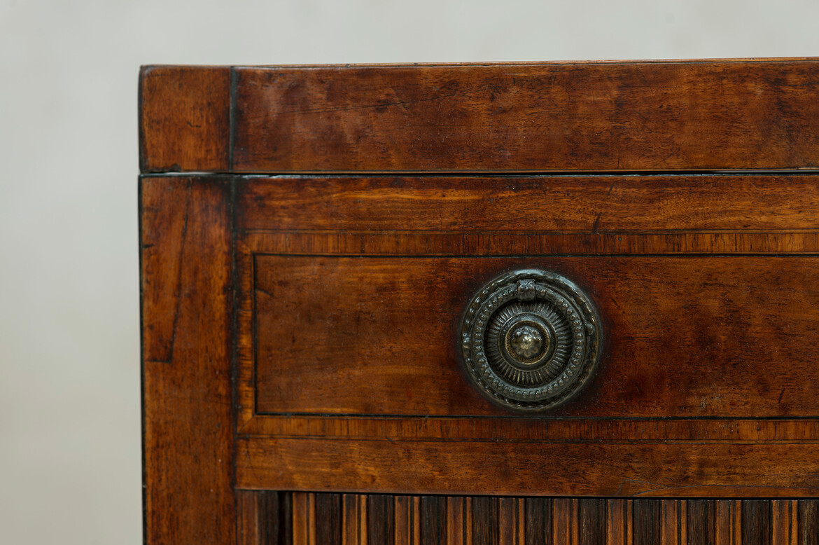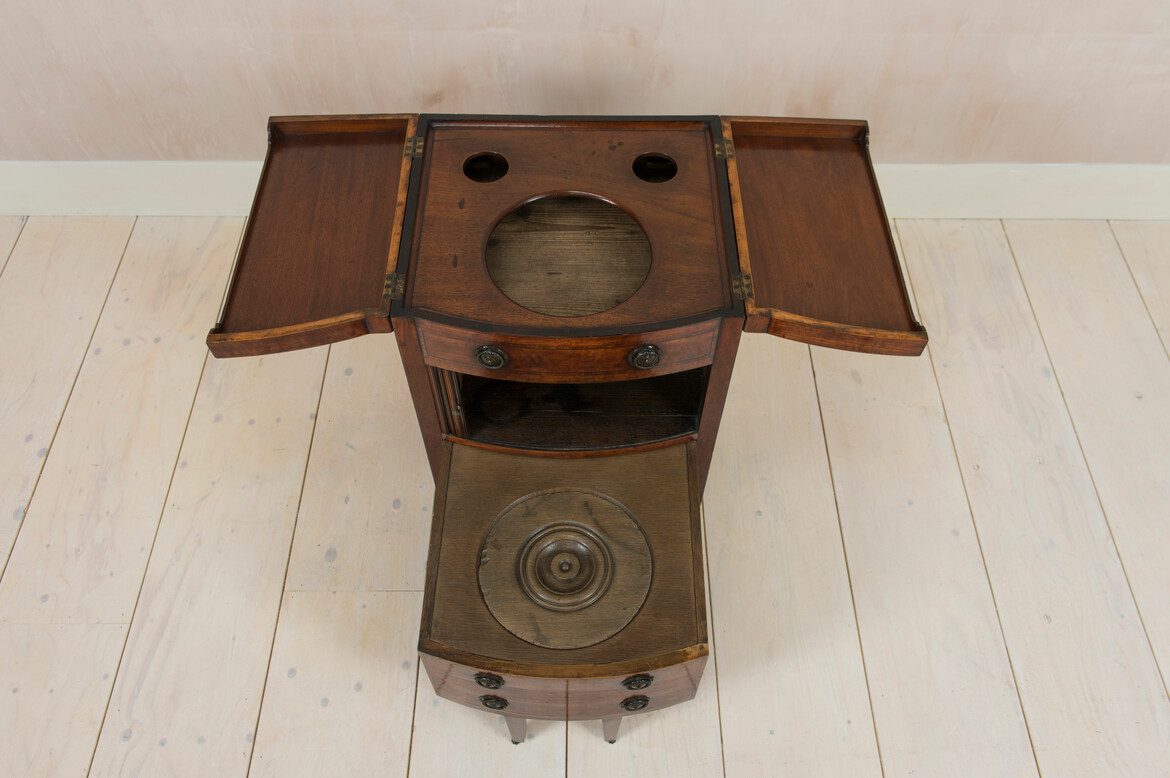 A fine George III satinwood bow-fronted bedside commode. The top ornamented with a floral decorated border. The front having a tambour door and all of its original handles. Wonderful patination. Circa 1790.