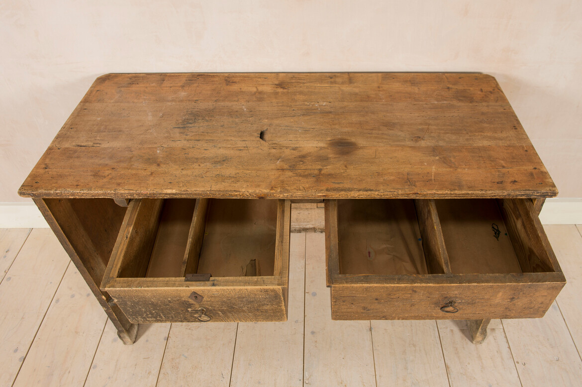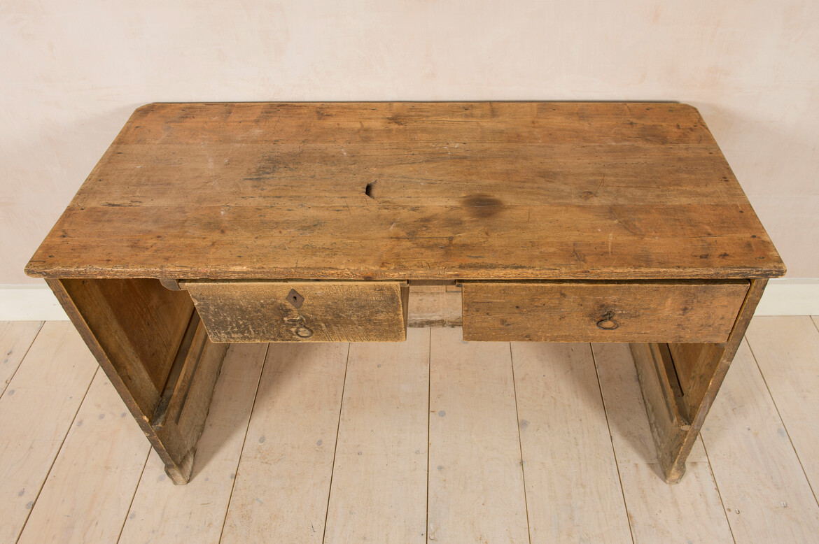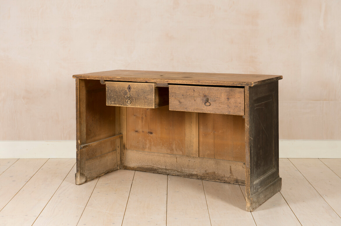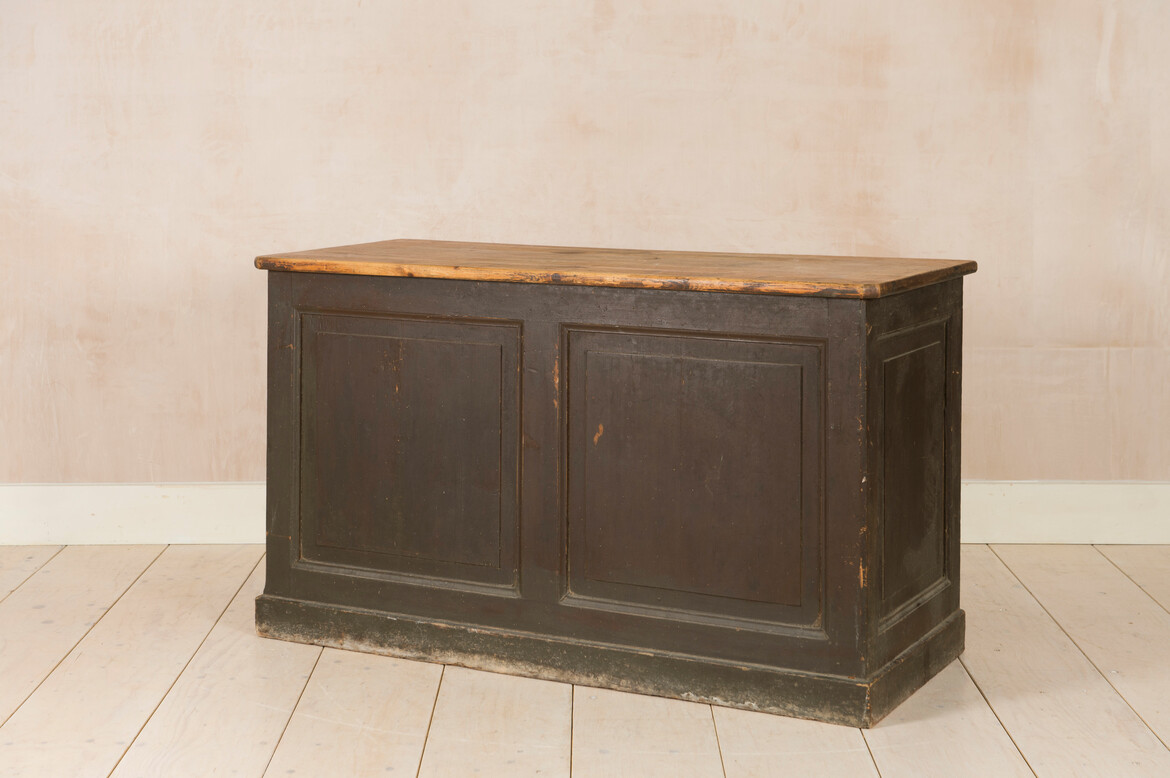 A mid-nineteenth century French pine shopkeepers counter with panelled front and sides, the open back fitted with two drawers. Circa 1800.