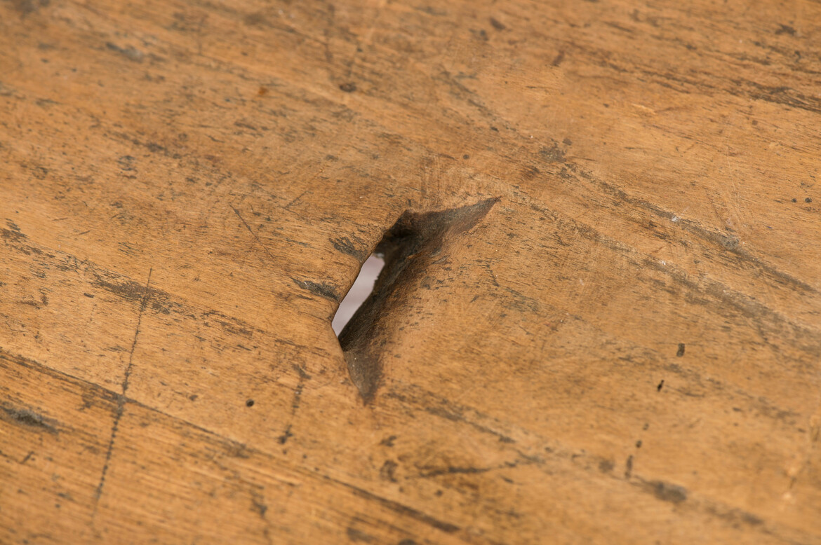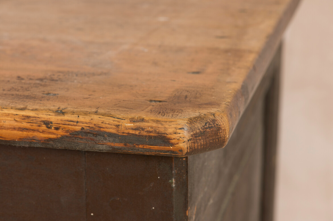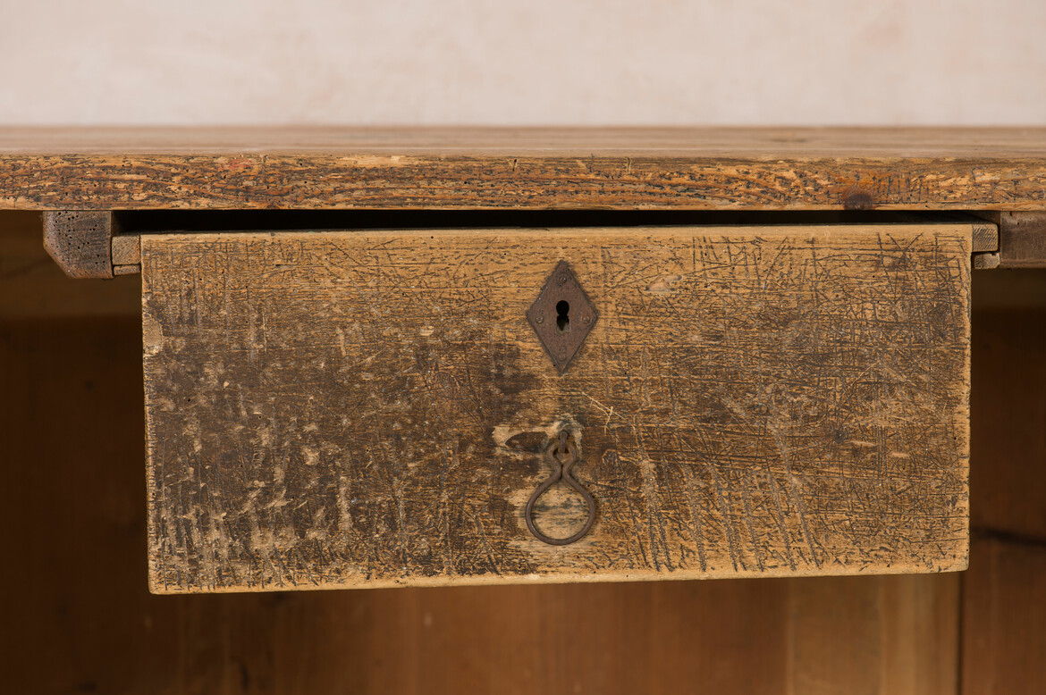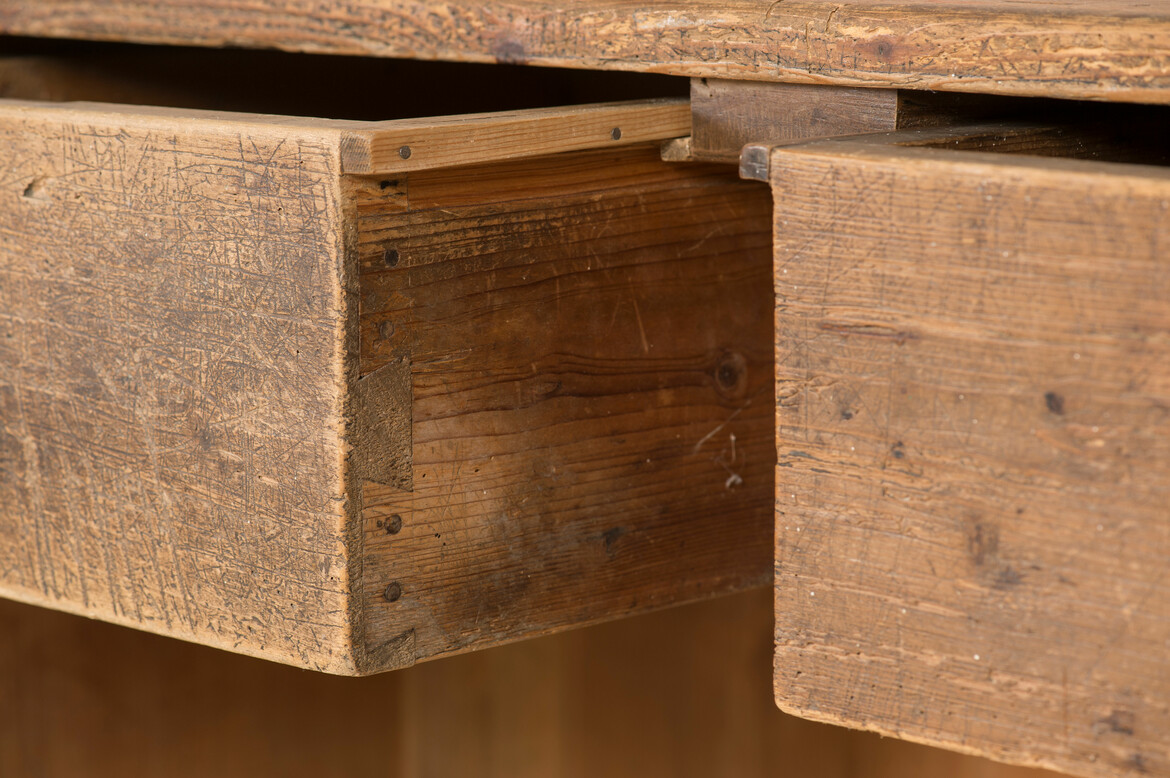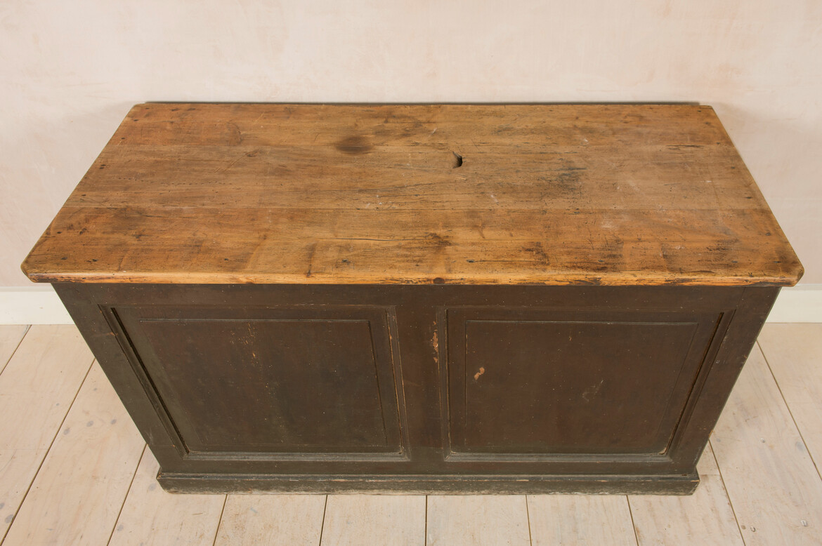 A mid-nineteenth century French pine shopkeepers counter with panelled front and sides, the open back fitted with two drawers. Circa 1800.