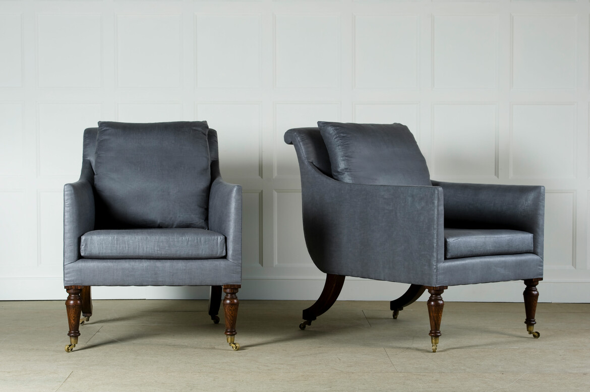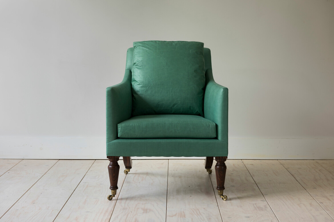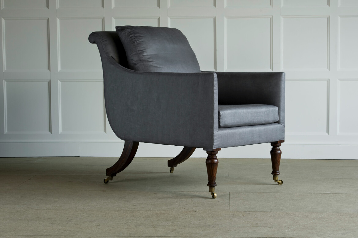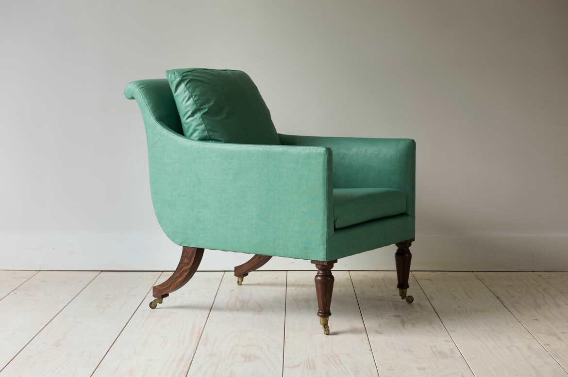 A younger cousin of the Scottish Chair, the Lyre Chair is related to designs made by Gillows of Lancaster for Fascque, the Gladstone family's Scottish home. The chair depicted having simulated rosewood legs and upholstered in green beetled Irish linen.
