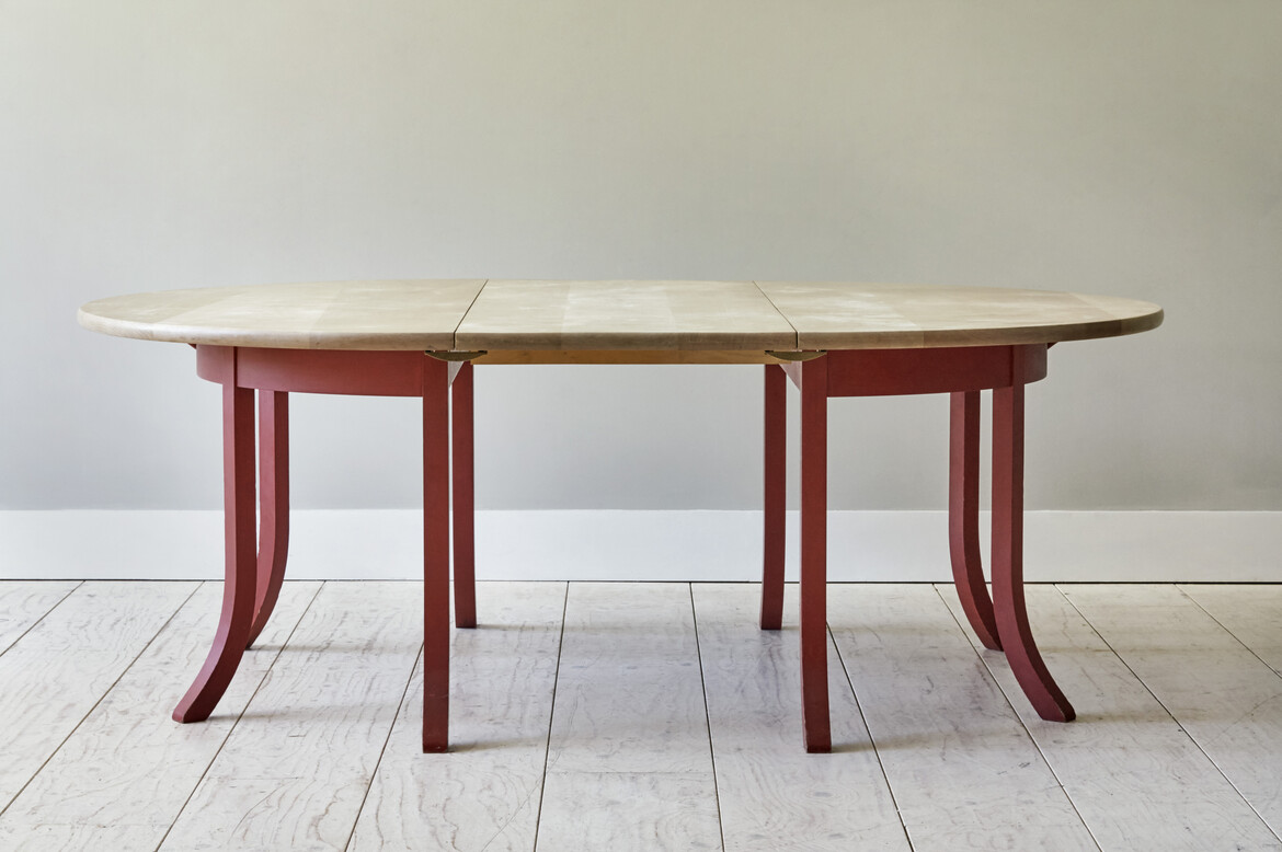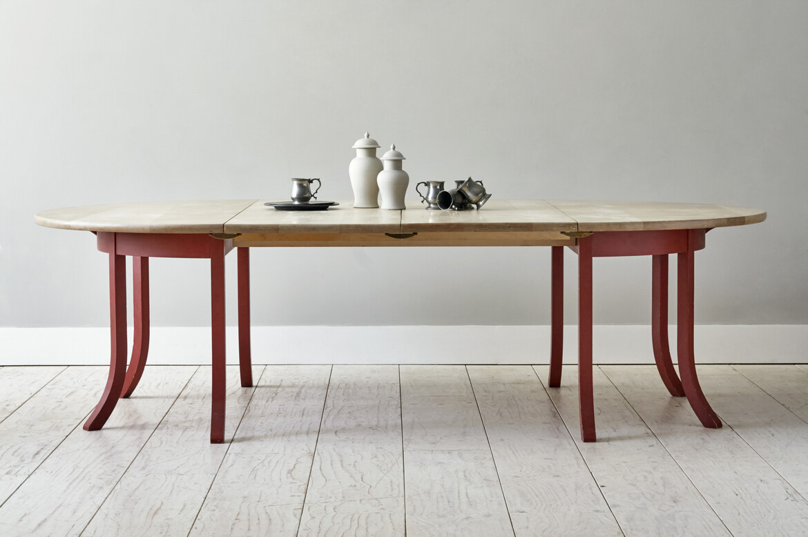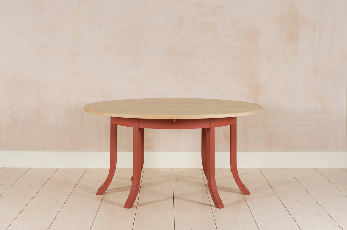 Handmade to order by skilled craftsmen, the extending Tumnus Table has a scrubbed raw sycamore top and painted tulipwood legs. The standard length is 269cm when fully extended (including two leaves at 58cm per leaf). Different sizes, finishes and colours are all possible. A solid walnut Tumnus Table is also available.