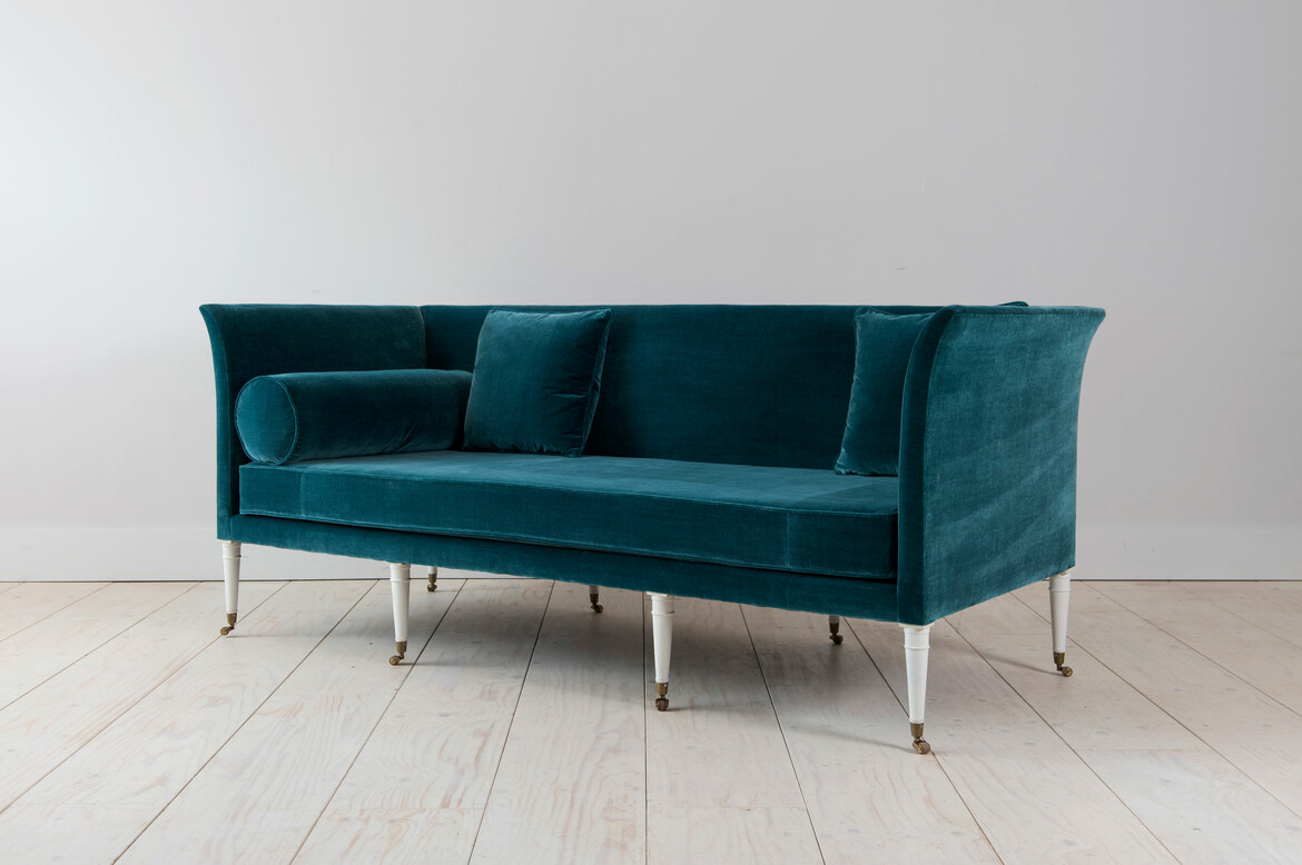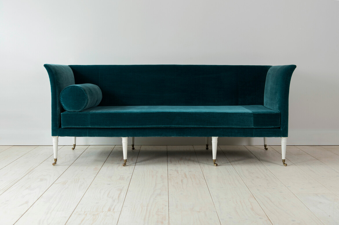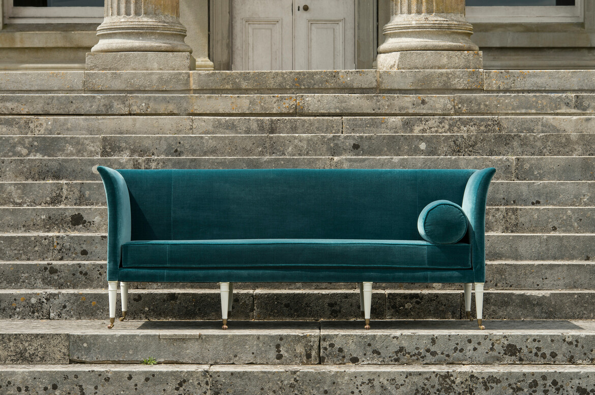Based on a sofa manufactured by Gillows for Uppark, a fantastic Queen Anne house perched ontop of the Sussex Downs, and now in the care of the National Trust. The model shown has a bolster cushion and white painted legs, but can also be made with hand-turned mahogany legs expertly finished to match the antique. The frame is made traditionally using only solid beech and all the joints are mortice and tenon. The frame is webbed and upholstered using traditional methods and can either have a single hair wrap seat, or alternatively can be upholstered with feather and down filled cushions on back, sides and seat.