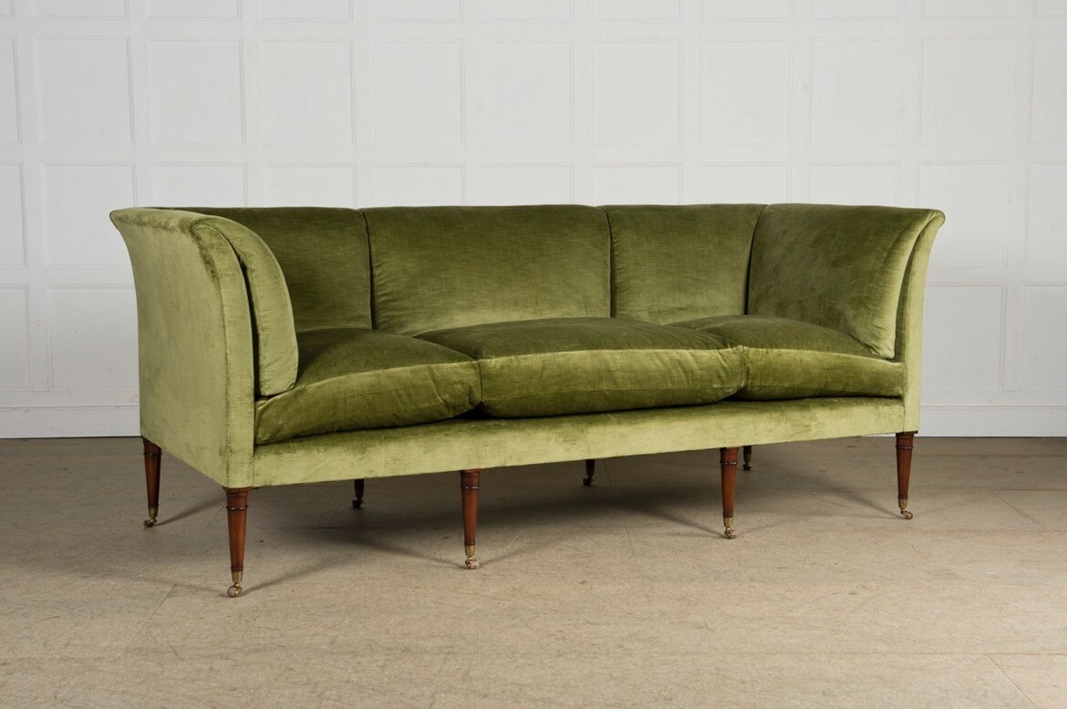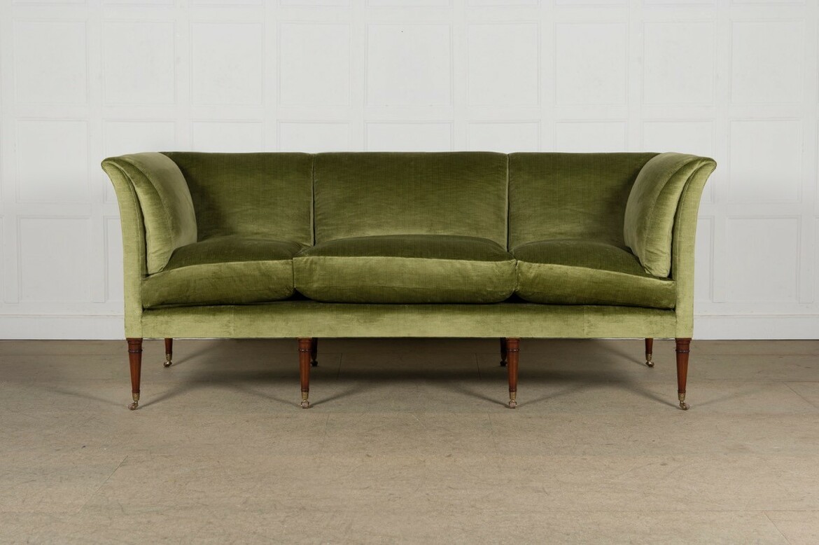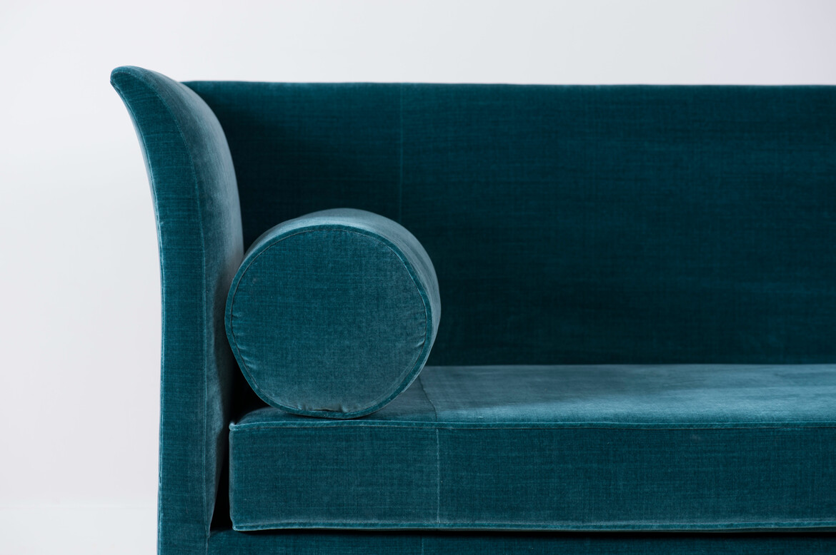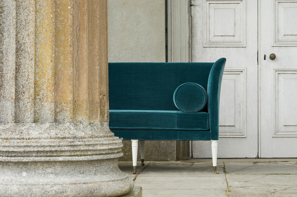 Based on a sofa manufactured by Gillows for Uppark, a fantastic Queen Anne house perched ontop of the Sussex Downs, and now in the care of the National Trust. The model shown has a bolster cushion and white painted legs, but can also be made with hand-turned mahogany legs expertly finished to match the antique. The frame is made traditionally using only solid beech and all the joints are mortice and tenon. The frame is webbed and upholstered using traditional methods and can either have a single hair wrap seat, or alternatively can be upholstered with feather and down filled cushions on back, sides and seat.