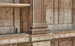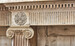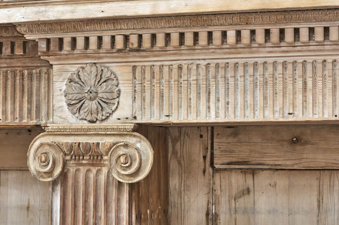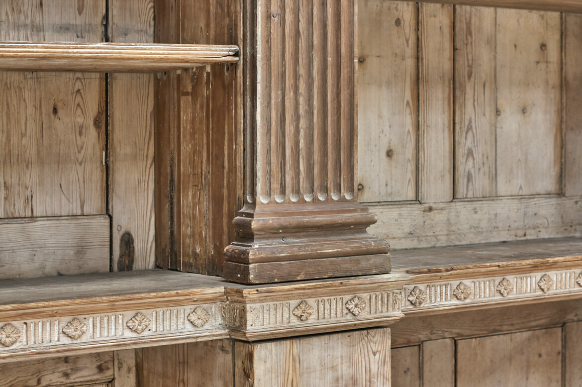 Constructed in pine, it does not appear to have ever been decorated. The outer wings are flanked by pilaster columns and capped by pedimented cornices. The plinth and pediment mouldings carved with leaf decoration. The waist moulding ornamented with fluting and paterae, the fluted pilasters are surmounted by ionic capitals, foliate leaf moulding and egg-and-dart decoration. The cornices decorated with a dentil moulding surmounted by a further moulding having intricate foliate carving. The flats of the cornice fluted and interspersed with large foliate paterae.
